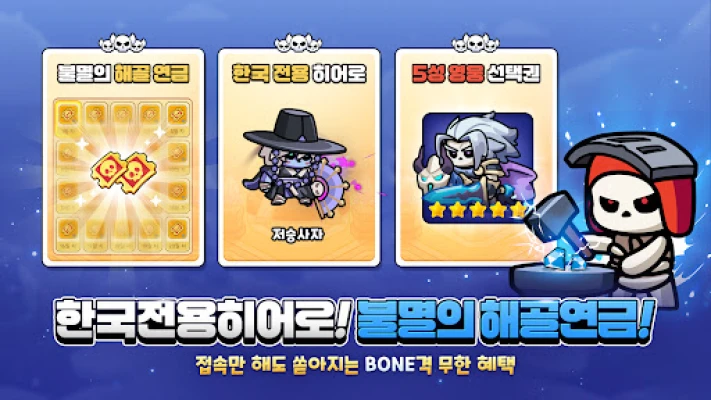 여유로운 해골 노후 생활도 놓치지 마세요. 자동 전투와 자동 성장 시스템이 당신의 군단을 끊임없이 강화하며, 오프라인 중에도 풍성한 자원이 차곡차곡 쌓입니다. 매일 아침 접속하는 것만으로도 당신의 언데드 제국은 더욱 강력해지며, 지하세계의 패권을 향한 여정은 멈추지 않을 것입니다. 지금, 당신만의 해골 왕국을 건설하고 불멸의 전설을 만드세요!
