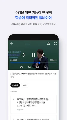 학습의 집중도를 극대화하기 위한 다양한 플레이어 기능들도 준비되어 있습니다. 0.5배속부터 4.0배속까지 지원하는 재생 속도 조절, 중요한 내용을 놓치지 않도록 돕는 북마크, 그리고 특정 부분을 반복하여 완벽히 익힐 수 있는 구간 반복 기능은 학습 효과를 한층 끌어올립니다. 화면 끊김 현상 발생 시 화질 조정이나 하드웨어 가속 설정 변경으로 최적의 시청 환경을 조성할 수 있으며, 화면 터치 제스처를 활용한 10초 앞/뒤 이동, 음량 조절, 재생/정지 등의 직관적인 조작으로 학습에만 온전히 집중할 수 있습니다. 플레이어 이용 중 문의사항은 각 단기 고객센터를 통해 1:1로 빠르게 해결할 수 있습니다.