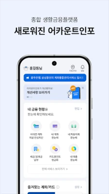 어카운트인포-계좌통합관리는 흩어진 금융 정보를 한눈에 모아 편리하게 관리하는 서비스입니다. 계좌, 카드, 보험, 대출 등 내 자산을 통합 조회하고, 잠자는 계좌나 포인트를 찾으세요. 자동이체와 세금/공과금 납부를 간편하게 처리하며, 안심 차단 기능으로 소중한 금융 자산을 안전하게 보호합니다. 전자증명서 발급 등 생활 속 다양한 금융 서비스를 한번에 누리세요.