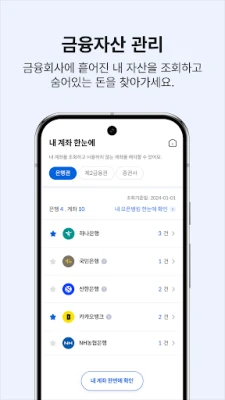 현대 사회에서 복잡하게 흩어진 금융 자산 관리에 어려움을 겪고 계신가요? 어카운트인포는 여러 금융기관에 퍼져 있는 나의 모든 계좌, 카드, 보험, 대출 정보를 한눈에 모아보고, 숨겨진 자산까지 찾아낼 수 있도록 돕는 혁신적인 금융 통합 관리 솔루션입니다. 더 이상 여기저기 방문하거나 로그인할 필요 없이, 잠자고 있던 계좌나 잊고 있던 포인트를 손쉽게 발견하고, 불필요한 금융 상품은 깔끔하게 정리하며 내 금융 생활을 완벽하게 통제하세요. 어카운트인포와 함께라면 복잡했던 금융 관리가 하나의 앱에서 시작됩니다.