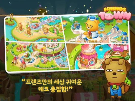 카카오프렌즈 친구들의 꿈같은 상상이 현실이 되는 곳, 바로 프렌즈타운으로 여러분을 초대합니다! 어피치의 달콤한 복숭아 정원부터 튜브의 신나는 서프라이즈 리조트, 그리고 무지개빛 즐거움이 가득한 무지의 놀이공원까지. 개성 넘치는 프렌즈들이 직접 설계한 특별한 공간들이 눈앞에 펼쳐져요. 동화보다 더 동화 같은 네오의 웅장한 성과 베일에 싸여있던 라이언 둥둥항구, 심지어 프로도의 로맨틱한 사막 별장까지, 이 모든 매력적인 세계가 프렌즈타운에서 여러분을 기다립니다.